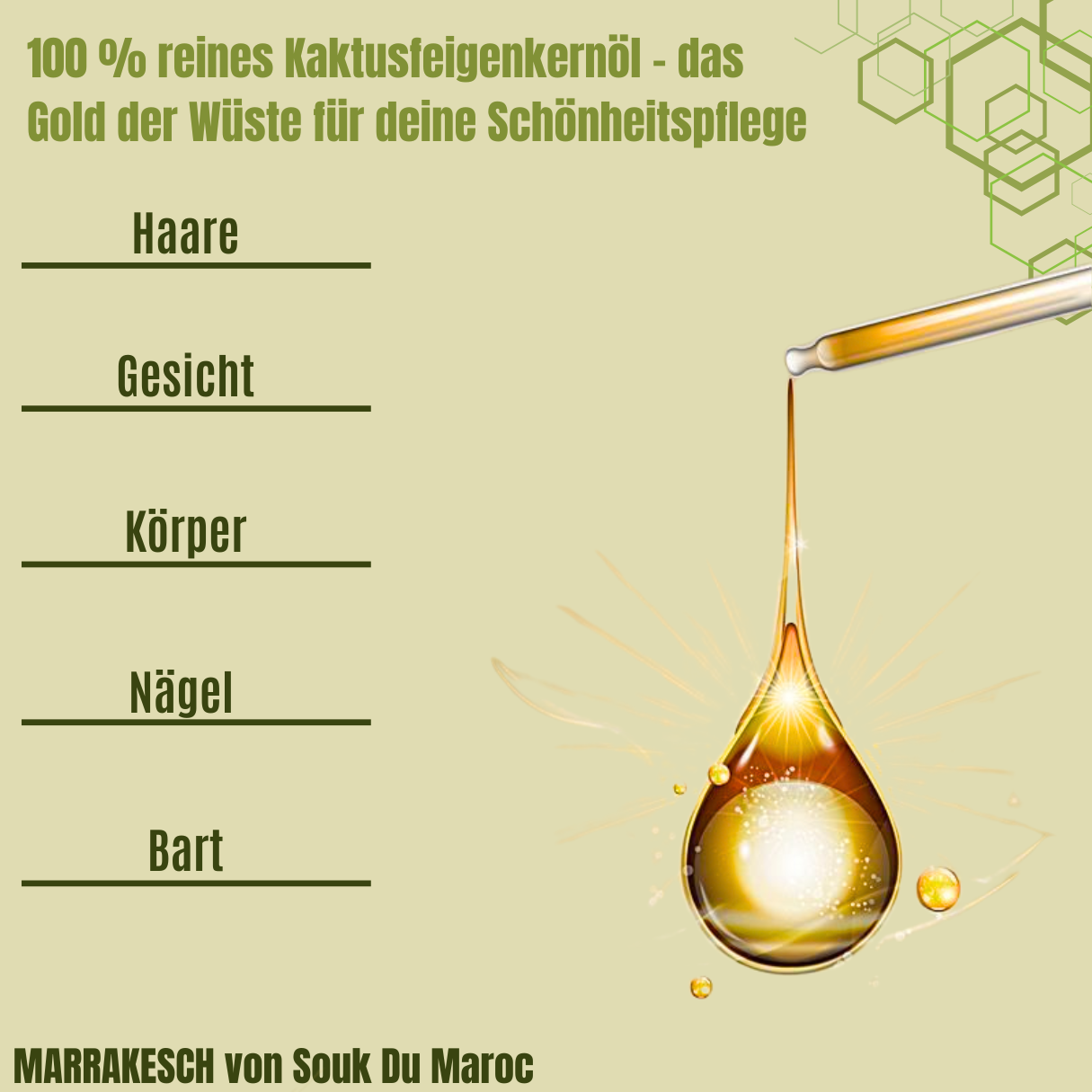 Marrakesch Kaktusfeigenkernöl eignet sich aufgrund der genannten Inhaltsstoffe hervorragend für die Gesichts-, Körper-, Haar- und Nagelpflege. Es unterstützt alle Hauttypen ohne Nebenwirkungen. Wenige Tropfen, die nach der Reinigung mit den Fingerspitzen in die noch feuchte Haut eingerieben werden, genügen, um die Durchblutung der Haut zu fördern, die Haut zu straffen und geschmeidig zu machen. Marrakesch Bio-Kaktusfeigenkernöl hat einen kühlenden, entspannenden und revitalisierenden Effekt auf die Haut. Es beugt der Faltenbildung vor und reduziert Augenschatten. Auch Haare werden durch sanftes Einmassieren des Öls revitalisiert. Nägel werden durch regelmäßiges Auftragen des Öls geschmeidig und fest.